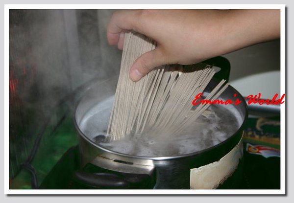 步驟一:煮一大鍋水,水開之後,將麵條放射狀放入滾水中。