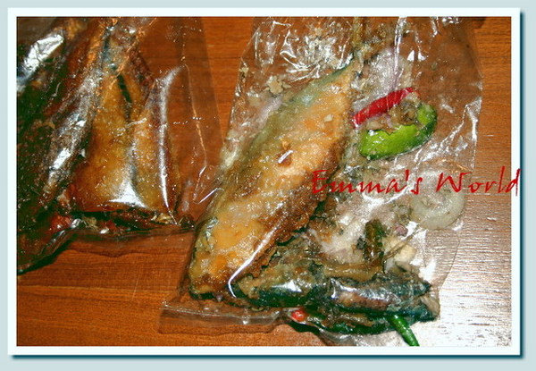 這袋沒有辣椒的魚當然就是我選的囉!毛爸的魚是用煎的,香香酥酥脆脆的,不怕辣的人,搭配上附贈的辣椒和各種香料,味道很棒!我這道魚,就像燻魚的味道,甜甜鹹鹹的,比較適合不太能吃辣的我!