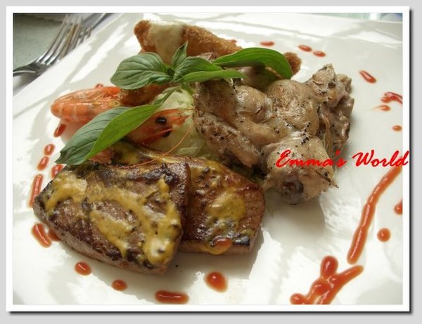 沒想到主菜一上來就更是驚人,所謂的海陸套餐就是有 豬排 雞排 魚和蝦,這一盤豐富的菜色挺義大利口味,幾乎每種都有用香草調味,炸魚味道很不錯,蝦子鮮度也夠,讓我們有點意外,沒想到這裏的套餐居然這麼豐盛。