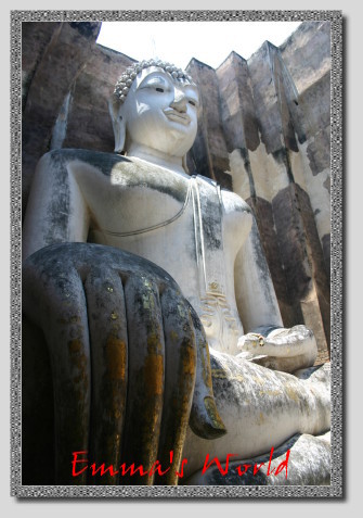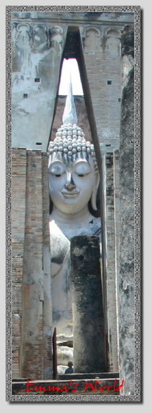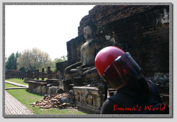 看完了藍坎亨王的雕像之後,決心要找到西昌寺,因為寺裡有我心中渴望已久的大佛。但怎麼找也找不到,只好定下心來仔細看看地圖,原來西昌寺在城外!二話不說,儘管毛媽已經不想看什麼佛阿塔的,大腳一踩離合器,換到四檔,殺出城外!兩人一車浩浩蕩蕩直奔荒野,卻因標示不清,又再次與目標錯過。最後我們騎在碎石一地雜草蔓生的小徑上,抵達了西昌寺的後面!看著這個大佛人都呆了,真的好大,看看右邊那張圖,正下方有個人當作比例尺,就知道這佛有多大了。至此,我心滿意足的按著快門,左一張右一張,啪啪啪一直拍。在這我們又碰到了白人情侶,後來回TR碰面時,那男生用羨慕的語氣說:「是啊!我看著你一直按快門... 讓我也在考慮是不是該換數位的相機了。」參觀完了大佛,可說是心滿意足,此行無憾啊!