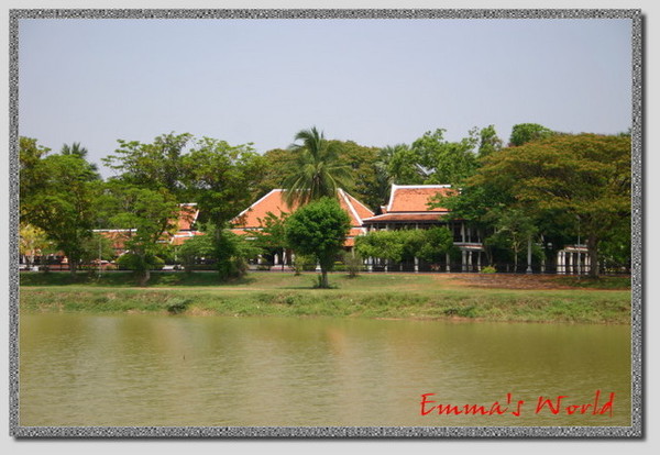 下面這張圖的右手邊有座橋,從橋過來就是菩斐鑾寺,而圖中看不清楚的建築就是旅客資訊中心了。到這個時候我們連把相機拿起來隨便按個快門都懶,所以儘管這座用心搭建的旅客資訊中心有很多特色,但我們像是在沙漠中的旅人,眼睛裡只有綠洲裡的水,只管無意識的往水源方向移動,直到喝到了水,才恢復意識。